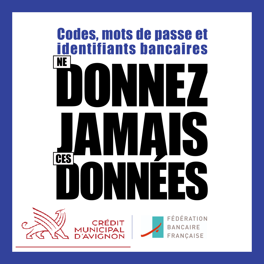 Aucun employé de banque ne vous demandera vos identifiants et mot de passe de connexion ou vos données de cartes bancaires. NE LES DONNEZ JAMAIS.